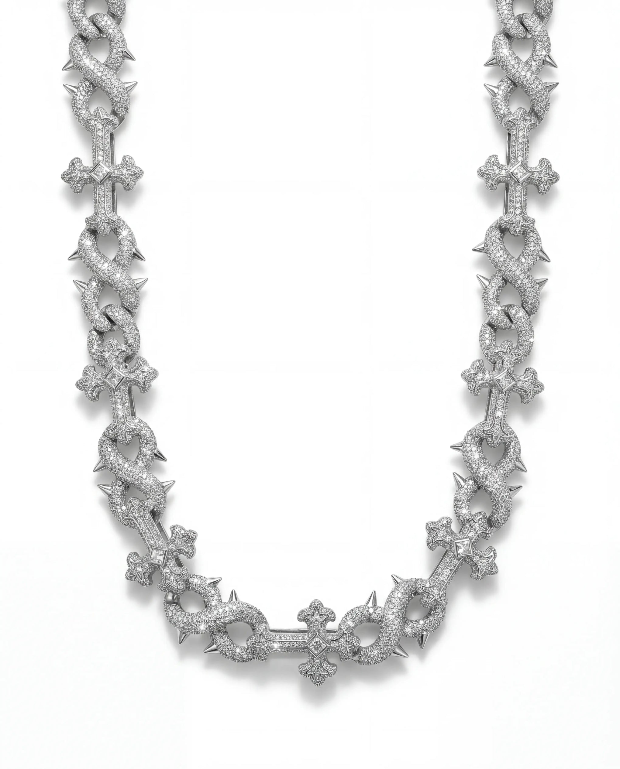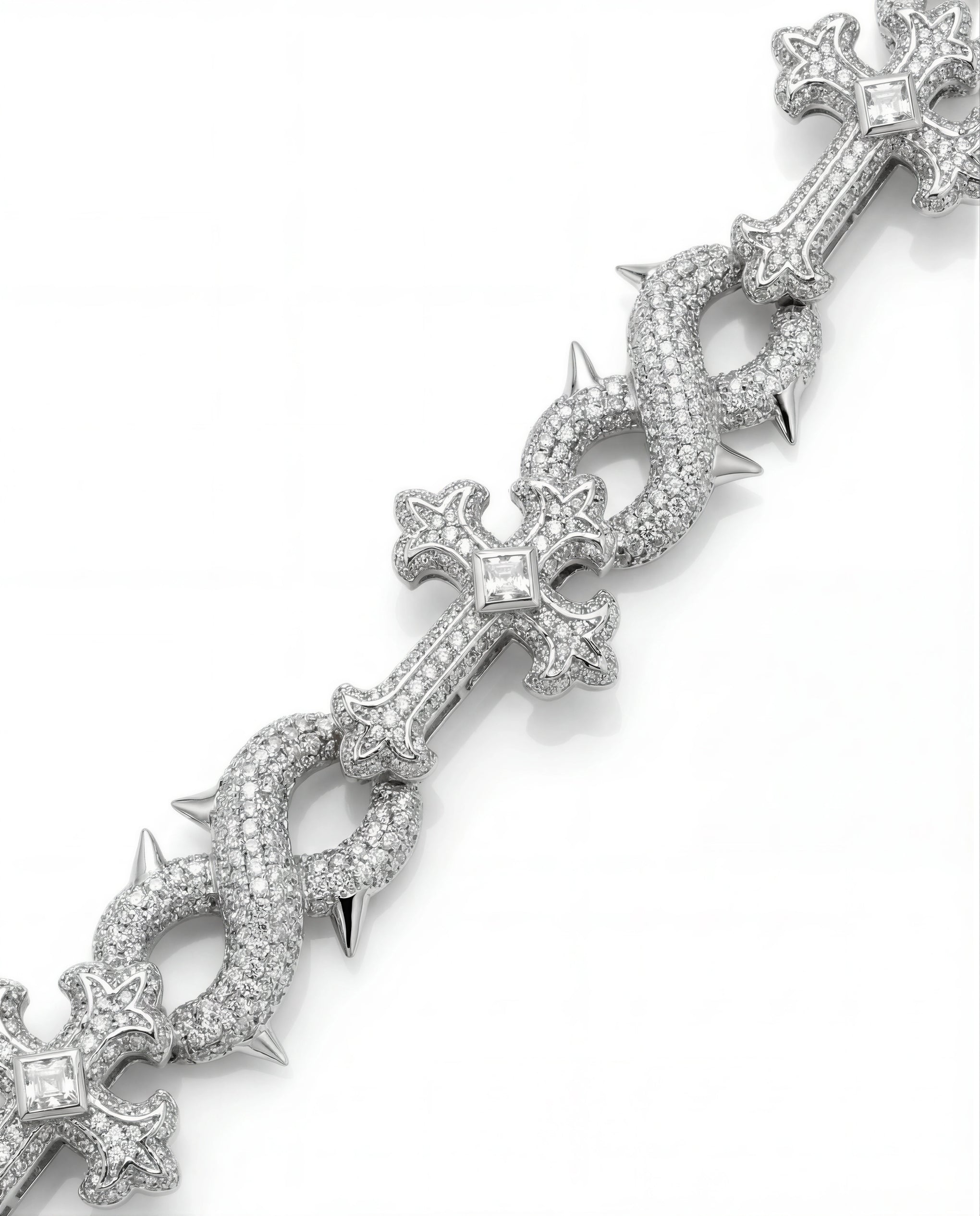The Thorned Chrome. 18mm chain alternating cross motifs with spiked links. Not subtle. Not for everyone.
