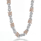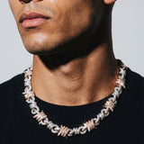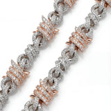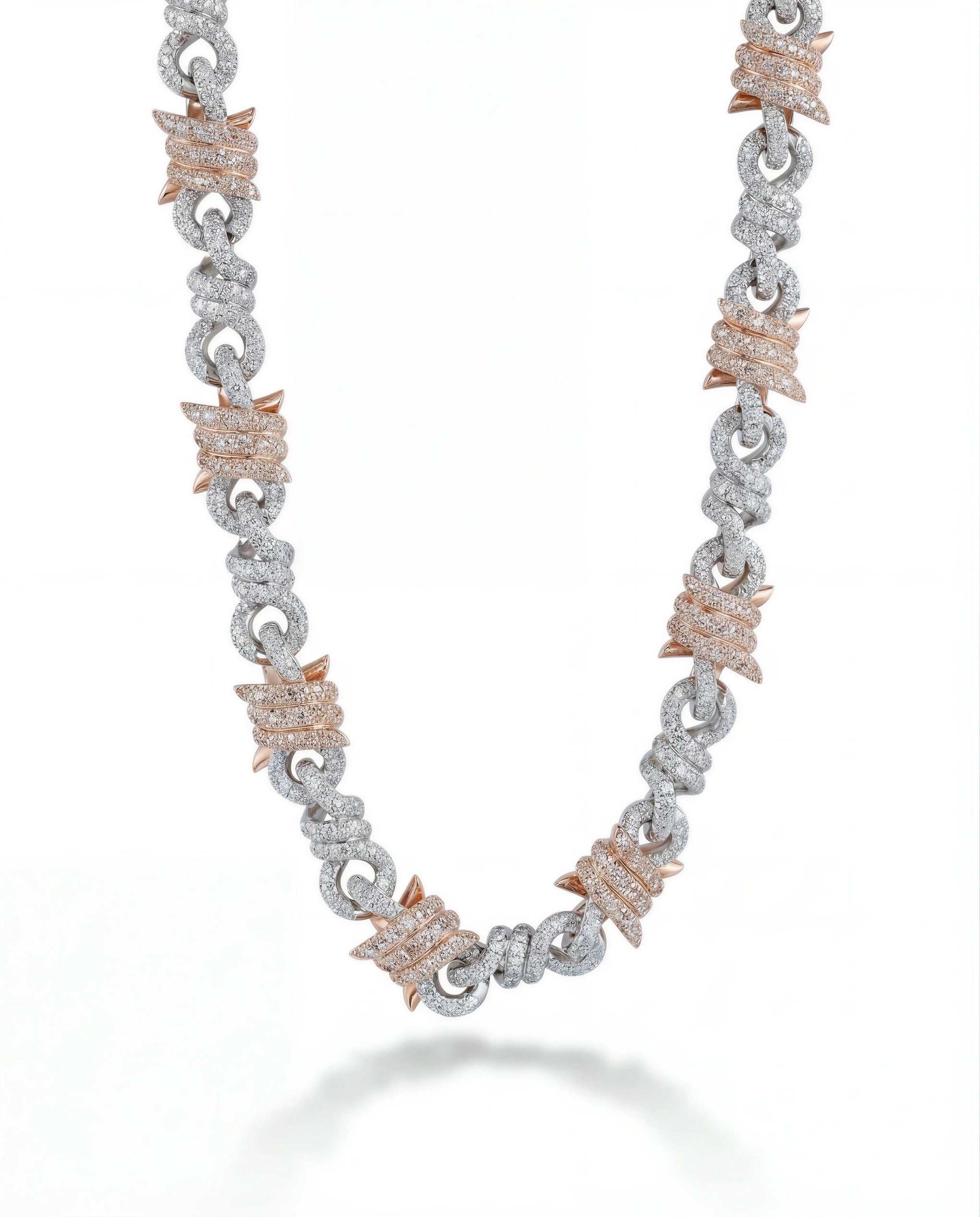 The Entwined Wire. 12mm two-tone Cuban with twisted rose gold and silver links. Barbed details woven throughout. Bold but refined.